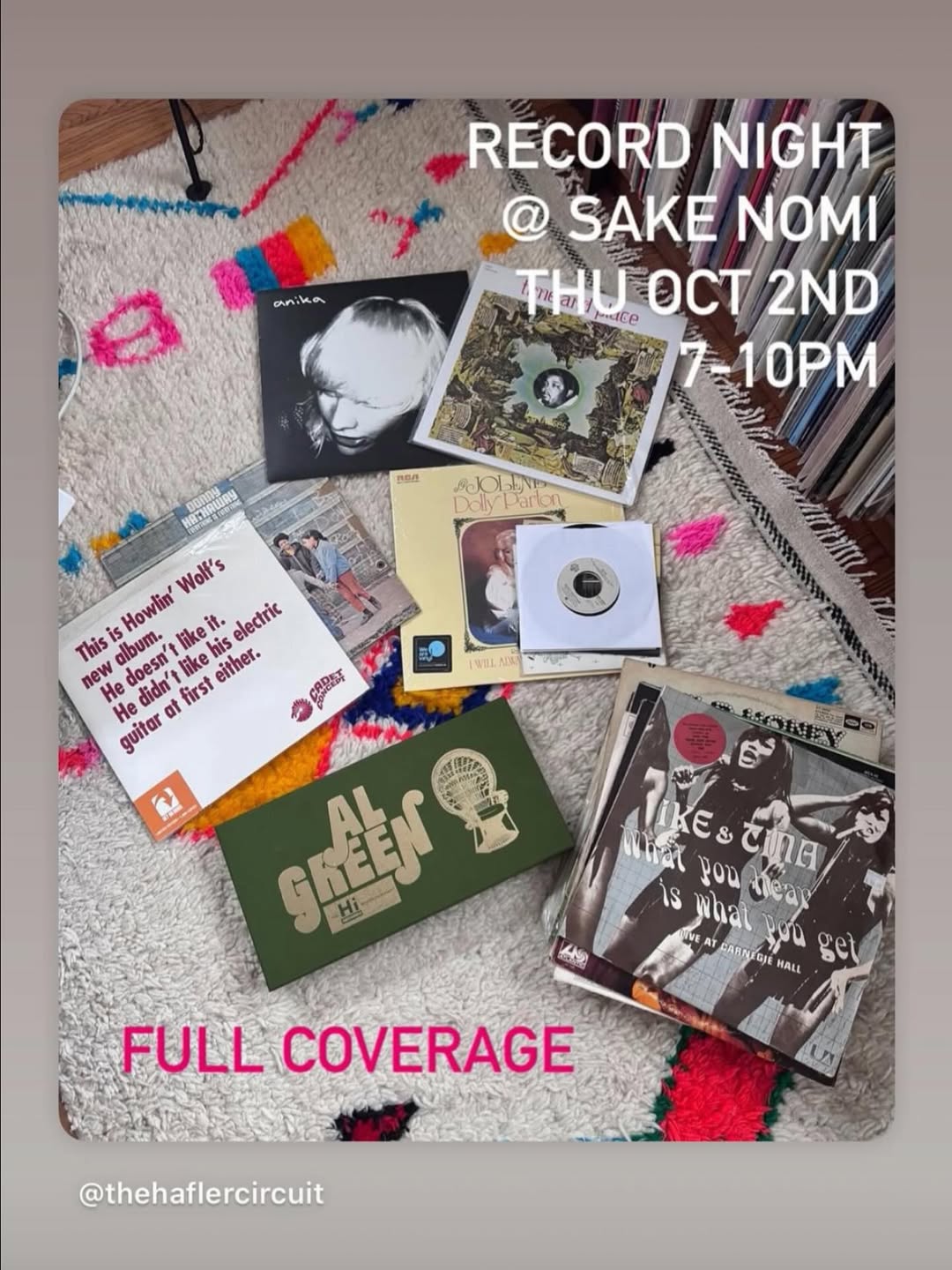Thursday, 10/2: Saké & Vinyl Night, at 7-10 pm presented by @thehaflercircuit. The evening’s scheduled program, “Full Coverage” will feature a variety of covers “of all types, including direct covers of classics, originals you thought were covers, and some fun with samples.”
