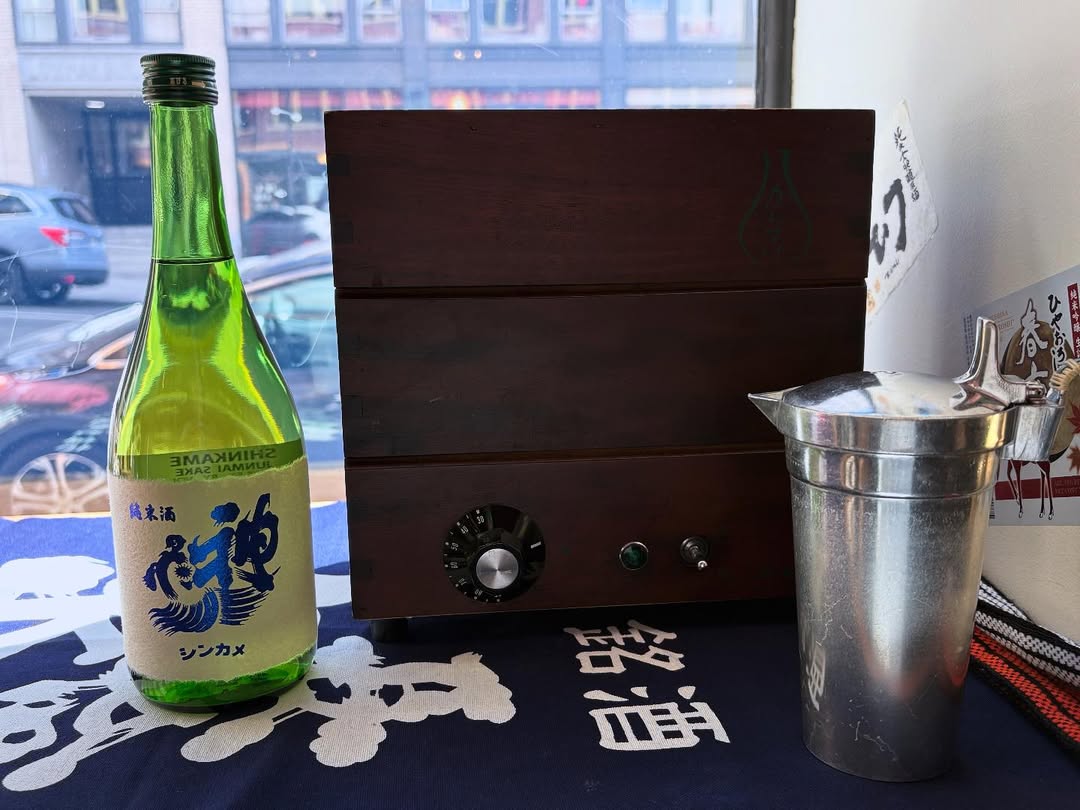 We’re kicking things off today by introducing the legendary Junmai sake from Shinkame Brewery of Saitama prefecture. The brewer recommends enjoying it at room temperature and a little warmer, so we’ve brought out the classic, trusted kansuke sake warmer.
